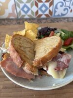 This is definitely one of the most popular sandwiches, saltiness of the bacon, sweetness of the chutney and tanginess of the brie is a winning combination. Served with salad and crisps.