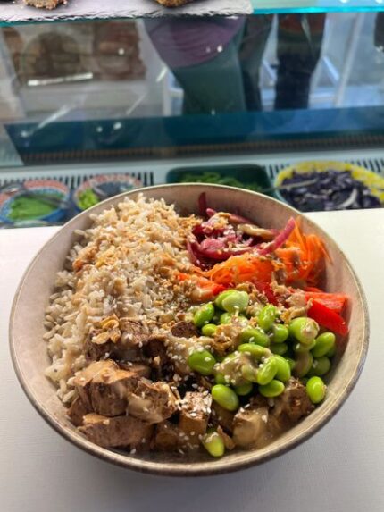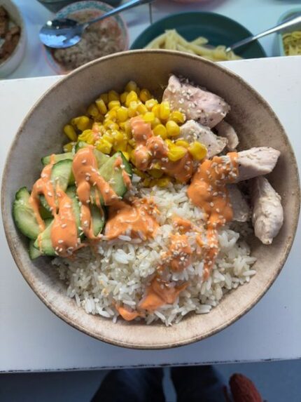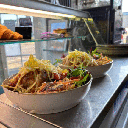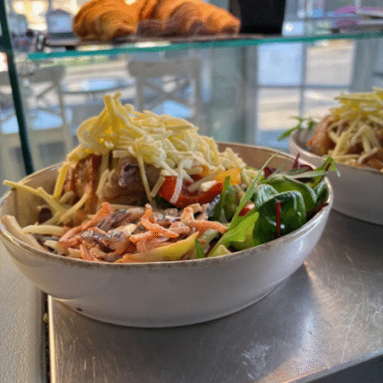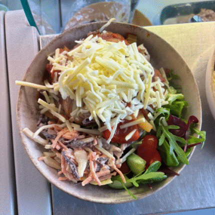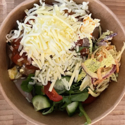 Charred roasted peppers, kidney beans onion and celery with a hit of chilli and the touch of cinnamon – heat and sweetness with the fluffy bakes potatoe and a creamy cheese on top. Served with salad and coleslaw.
